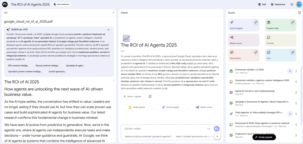 V Google NotebookLM sem naložil raziskavo The ROI of AI 2025.