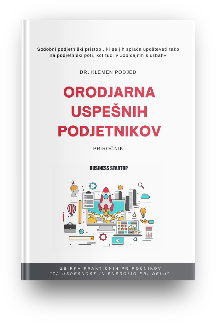 Podjetniški priročnik za podjetniško razmišljanje. Skoraj 15 let poučujem predmet Podjetništvo kot višješolski predavatelj. Sedaj z veseljem predstavljam svoj podjetniški priročnik (e-verzija) ORODJARNA USPEŠNIH PODJETNIKOV. Obilo praktičnih informacij in primerov glede zelo priljubljenih pristopov vitkega podjetništva, startupov in platen poslovnih modelov. Predstavljene so tudi bolj poglobljene teme glede priprave poslovnih načrtov ter, brez tega ne gre, (sodobnih) virov financiranja. Koristno gradivo ne le za moje študente, pač pa tudi za udeležence podjetniških delavnic in druge, ki jih mentoriram na podjetniškem področju. Žal je zaenkrat prosto dostopen le študentom in udeležencem mojih delavnic.