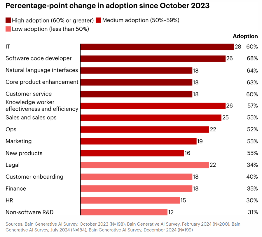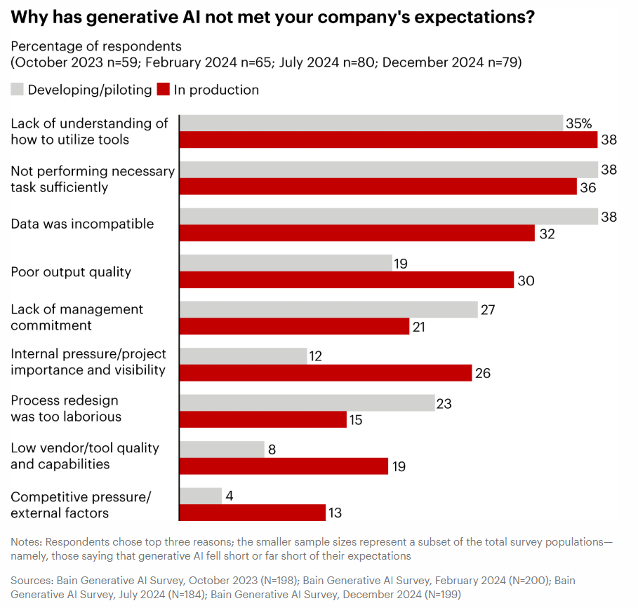 A nova raziskava Bain & Company poudarja nekaj zelo zanimivih ugotovitev. 95 % podjetij že uporablja generativno AI. Večina pa še vedno ne ustvarja prave vrednosti.